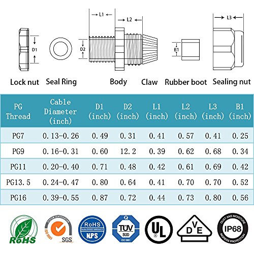 - Cable range: PG7 (0.12 - 0.26 inches); PG9 (0.16 - 0.31 inches); PG11 (0.2 - 0.4 inches); PG13.5 (0.24 - 0.43 inches); PG16 (0.4 - 0.51 inches)