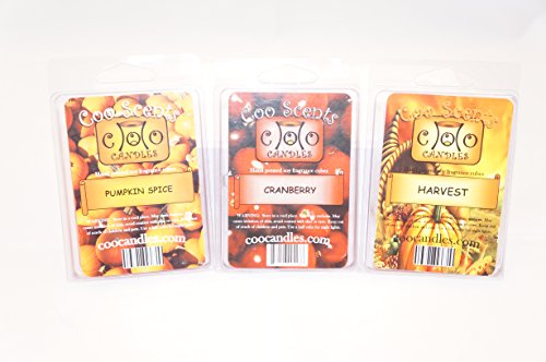 Harvest is a lighter CInnamon scent, while Cranberry and Pumpkin Spice are stronger. Melts at a lower temperature than paraffin