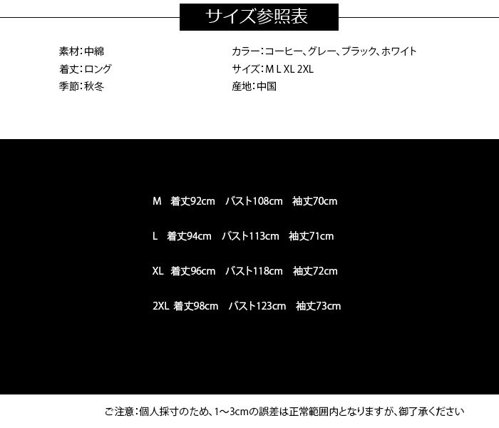 ダウンコート レディース ダウン綿コート Aライン 軽い ダウンジャケット 大きいサイズ レディース 中綿コート 上品 2018秋冬新作 ダウン綿コート レディース ロング ダウンジャケット 大きめ商品詳細素材:中綿着丈:ロング季節:秋冬カラー:コーヒー、グレー、ブラック、ホワイトサイズ:M L XL 2XL産地:中国サイズ参照表M 着丈92cm バスト108cm 袖丈70cmL 着丈94cm バスト113cm 袖丈71cmXL 着丈96cm バスト118cm 袖丈72cm2XL 着丈98cm バスト123cm 袖丈73cmご注意:個人採寸のため、1~3cmの誤差は正常範囲内となりますが、御了承ください。ダウンコート レディース ダウン綿コート Aライン 軽い ダウンジャケット 大きいサイズ レディース 中綿コート 上品 2018秋冬新作 ダウン綿コート レディース ロング ダウンジャケット 大きめ