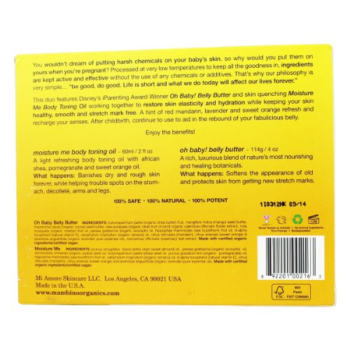 -. Feature : oh baby! belly butterTM (4 oz / 114 g) - A rich, luxurious blend of nature's most nourishing and healing botanicals / Softens the appearance of old and prevents new stretch marks. / moisture meTM body toning oil (2 oz / 60 ml) - A light refreshing body toning oil / Boosts collagen production, firming trouble spots in the stomach, decollete, arms and legs.