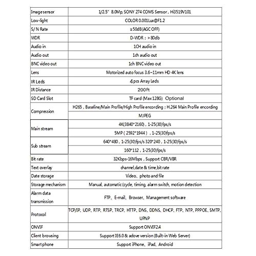 -. Feature : 4K 8MP UHD IP Bullet Camera,H.265/H.264,8.0MP Sony IMX274 Starvis CMOS Sensor,HI3519V DSP,4Pcs Arry Leds,200Ft Night Vision,Build-in SD Card Slot With 32GB Card / Resoluiton : Realtime 4K(3840X2160)@30fps;5MP(2592x1944)@30fps;3MP@30fps / Motorized Lens 3.6~11mm Ultra HD 4K,Remote Control Auto Zoom&Auto Focus Through NVR,PC Software / POE Function,Power Over Ethernet,One Cable Transfer Data&Power;Audio Function: 1CH RCA Input&Output / Plug&Play,Motion Detect&Email Alert,FTP,Plug&Play,ONVIF,Remotely View By Free Suppport Android Phone&iPhone,Tablet PC