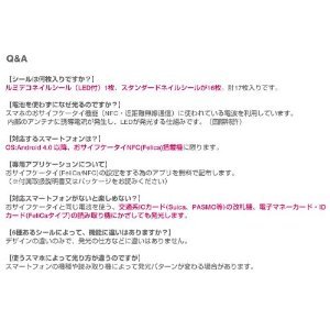 - 【商品詳細】パッケージ:約縦17×横6.5×厚0.3cm/セット内容:ルミデコネイル(LED付シール)x1枚、ネイルファイルx1個、スタンダードネイルシール(LED無)x16枚、取扱説明書/対応OS:Android 4.0以降/対応機種:おサイフケータイ NFC(Felica搭載)