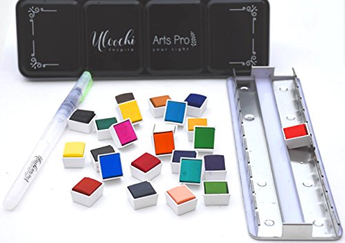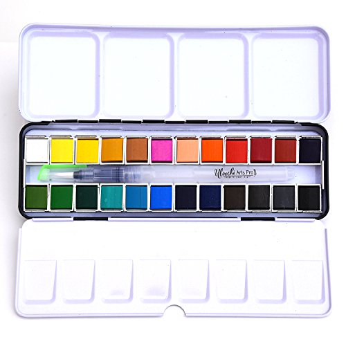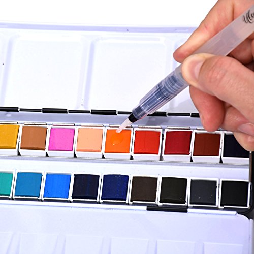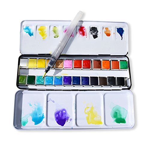 Watercolor Art Paint Set - Portable Painting Kit ( 24 Premium Colors Half Pans + Water Brush Pen + 2 Metal Tray Palletes )