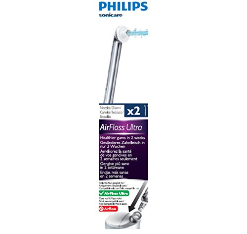 Philips AirFloss Pro Floss Spouts AirFloss Ultra Healthier gums in 2 weeks, guaranteed The nozzle AirFloss Ultra is the easiest and most effective way to clean between teeth. Ideal for those who do not use the wire. CHARACTERISTICS Efficacy clinically proven equal to floss gum health ** The nozzle of Philips Sonicare AirFloss Ultra is clinically proven to improve the health of the gums like floss. ** Helps improve gum health in just two weeks. Plaque removal up to 99.9% *** It removes up to 99.9% of plaque from the treated areas. *** It helps to prevent cavities in your teeth Gently removing the water plaque that brushing is not removed, the nozzle of Philips Sonicare AirFloss Ultra helps prevent the formation of cavities between teeth. Air technology and micro-drops Our unique technology that combines air and water or mouthwash, provides clinically proven results for a gentle and effective cleaning between teeth and along the gum line. Spout high performance The nozzle of the new AirFloss Ultra high performance intensifies the power of our air technology and micro-drops for greater effectiveness and efficiency. Customizable settings for up to three jet sprays You can customize the effective jet nozzle AirFloss Ultra according to your tastes, with a splash single, double or triple each time the trigger button. An easy way to gain a healthy habit Interproximal cleaning is essential for the health of the oral cavity. AirFloss helps so simple to make deep interdental cleaning a healthy habit.