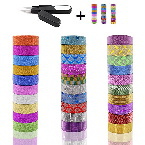 Washi Masking Tape Set of 30 Rolls, YARKOR Decorative Craft Tape Collection for DIY and Gift Wrapping Office Party Supplies with Stainless Steel Scissors