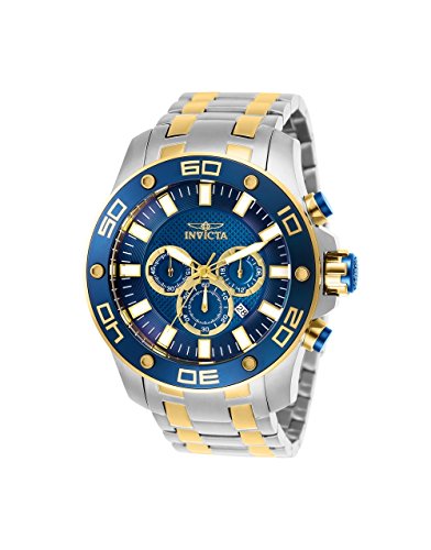 Silver-tone stainless steel case with a two-tone (silver-tone and gold-tone) stainless steel bracelet. Uni-directional rotating blue aluminum bezel. Blue dial with gold-tone hands and index hour markers. Minute markers around the outer rim. Dial Type: Analog. Luminescent hands and markers. Date display between 4 and 5 o'clock position. Chronograph - sub-dials displaying: three - 60 second, 60 minute and 24 hour. Hattori Caliber VD53 quartz movement. Scratch resistant flame fusion crystal. Pull / push crown. Solid case back. Round case shape. Case size: 50 mm. Band width: 30 mm, band length: 7.75 inches. Deployment with push button release clasp. Water resistant at 100 meters / 330 feet. Functions: chronograph, date, GMT, second time zone, hour, minute, second. Sport watch style. Watch label: Japan Movt. Invicta Pro Diver Chronograph Blue Dial Mens Watch 26082.Feature
