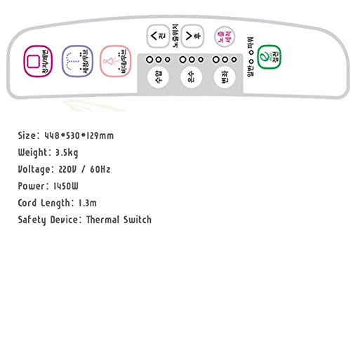 -. Feature : Brand: Novita / Voltage: 220V / 60Hz / 1450W / Size: 448*530*129mm /3.5kg / Features & Functions: Continuous Warm Water, Stainless Nozzle, Auto Nozzle Cleaning, Heated Seat / Managing water pressure & Nozzle position