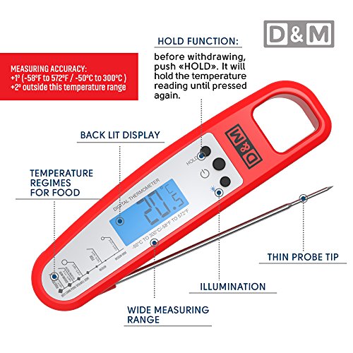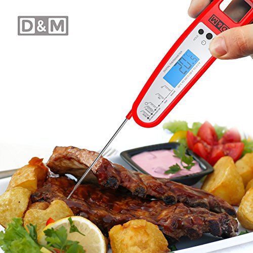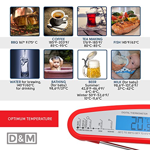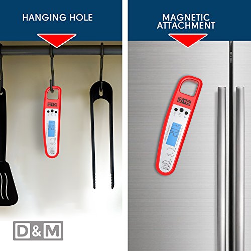 D&M Digital Meat Thermometer – Instant Read & Foldable - Ideal as Internal Meat Thermometer, Grill Thermometer, Cooking or Kitchen Thermometer – Food-safe Sturdy Steel Meat Thermometer Probe, Red