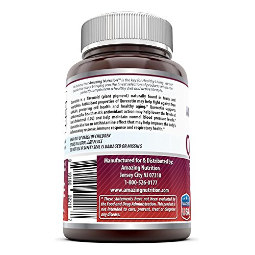 -. Feature : Quercetin is a flavonoid (plant pigment) naturally found in fruits and vegetables. It is found in many foods, such as red wine, onions, green tea, apples, berries etc. It known for its Anti-oxidant and Anti-Inflammatory Properties. Amazing Nutrition Quercetin 500 Mg is offered in Veggie Capsule to suit most diet preferences / Anti-oxidant properties of Qurecetine Supports Healthy Ageing, Cardiovascular Health, and Immune Health. It helps to reduce the damage and irritation caused by free radicals / Anti-Inflammatory properties of Quercetin helps to lower the release of histamines, a compound that is released by cells in response to allergic and inflammatory reactions. Subsequently helping to lower pains and discomfort related to Inflammation. / All Amazing Nutrition products are manufactured in accordance with Good Manufacturing Practices (GMP), among the highest standards in the world. / All our products are proudly made in USA with Guaranteed Purity & Potency. We offer best quality products for the best value. All our products are Third Party Tested. We do not compromise on quality.