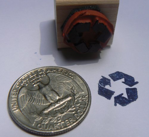 Miniature recycle rubber stamp. Deep etched and wood mounted. Measures 0.5x0.5"