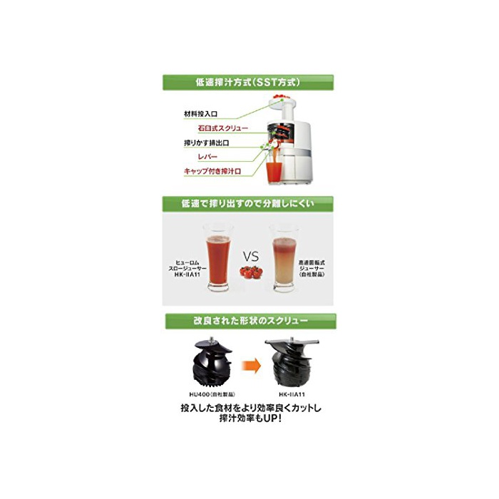 소재를 고속으로 분쇄하거나 잘게 자르는 것은 아니고, 그대로 천천히 시보리 내는 SST방식(저속착 즙방식)의 쥬스입니다.쥬스와 카《스》(고형 성분)를,나눠 배출하는 설계가 특징.