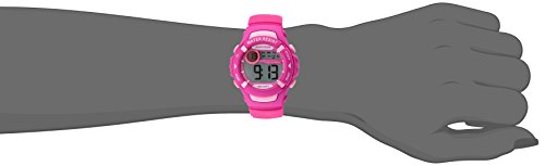 -. Feature : Magenta resin case with light pink accents; LCD display with time, seconds, day and date; magenta resin strap with buckle closure / Functions include: dual time, alarm, lap time and backlight with three second delay / Quartz Movement / Case Diameter: 34mm / Water Resistant To 100m (330ft): In General, Suitable for Swimming and Snorkeling, but not Diving