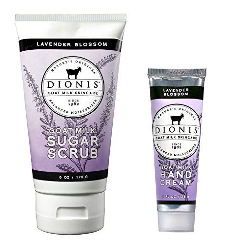Dionis Goat Milk skincare set that includes one 6-ounce Sugar Scrub and one 1-ounce hand cream in "Lavender Blossom" scent.