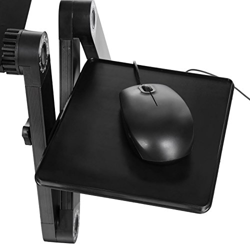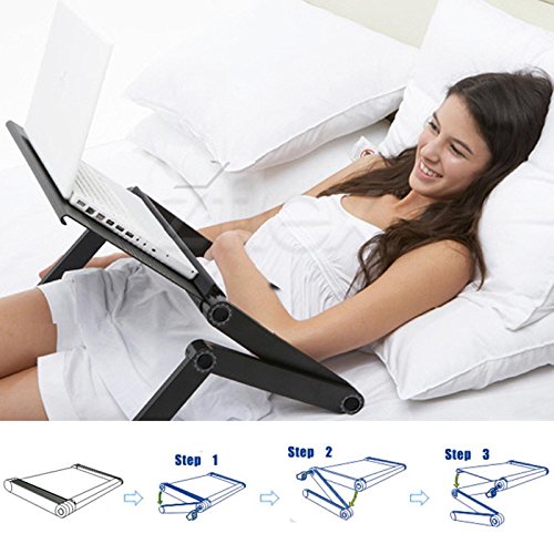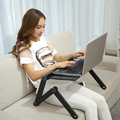 -. Feature : Sturdy: This notebook desk is made of Alloy material, sturdy and durable to use. One notebook desk and one mouse board design gives a better operation experience / Adjustable: 360 rotating degree design, 3 knobs on each folding arm, you can adjust to a comfortable angle according to your needs / Foldable: Lightweight and foldable design makes you more easy and convenient to carry and save space / Multifunction: It is not only just a laptop stand, but also can be used as a writing desk, sketchpad, cooling pad, folding tray table, tablet PC bracket, you can use it on the bed, on the couch, in office / Size: table dimension-- 48 x 26cm/18.7 x 10.1inch (L x W), mouse board dimension: 18 x 16cm/7.0 x 6.2inch (L x W)