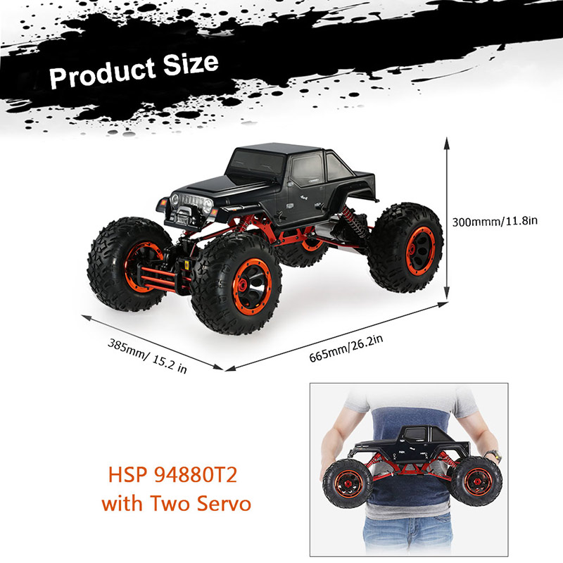 The original HSP 94880T2 1/8 4WD electronic powered brushed motor rock crawler you will ever find, with all the options you will ever need. It is now available completely ready to run. Just go enjoying the fun!