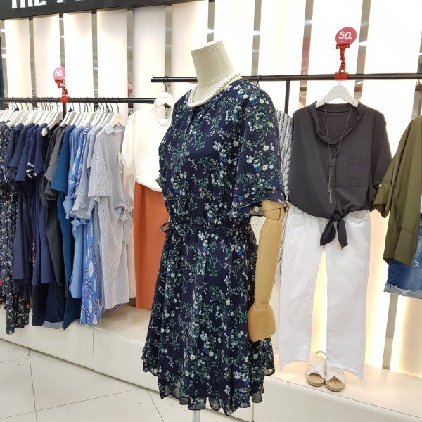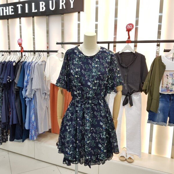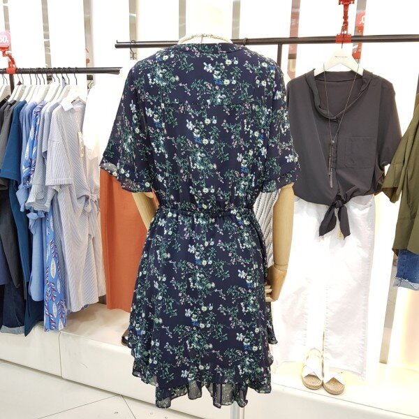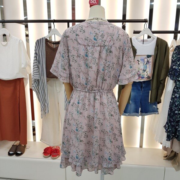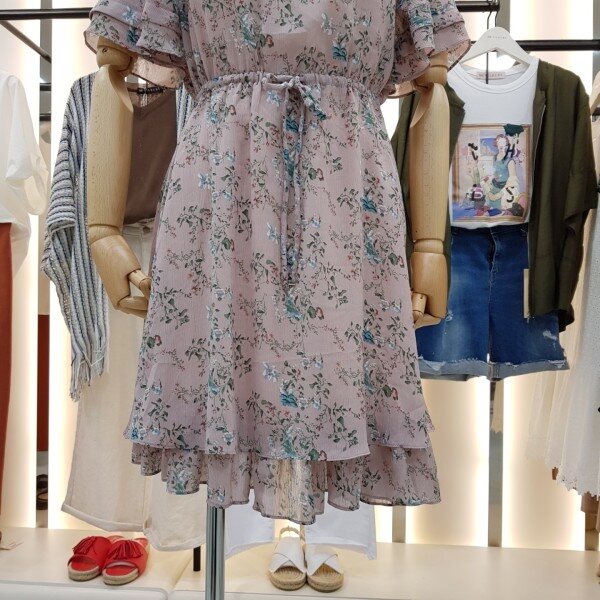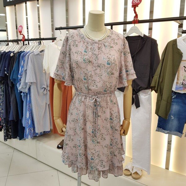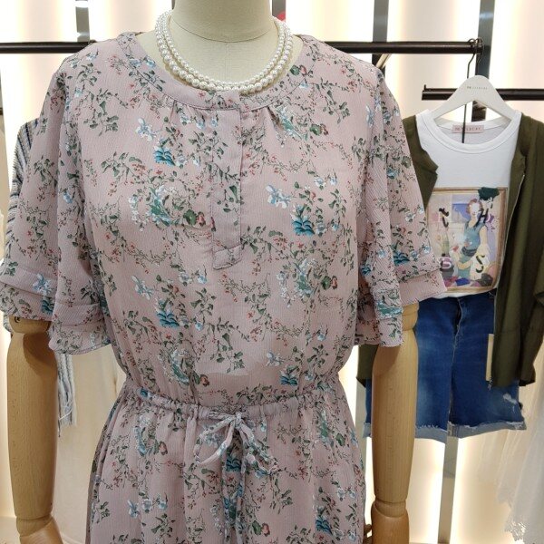 밑단과 소매부분 캉캉 스타일의 쉬폰원피스입니다.잔잔한 플라워패턴이 여성스럽고 사랑스러운 디자인입니다.