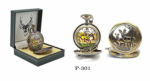 -. Feature : Watch features an intricately detailed cutout design on the lid, encasing a 1.5" dia. watch with gold-look Roman numerals, and a full-color image depicting a pair of deer. / Hangs from an 11.5"L link chain and clip. / Presented in 3.5" x 3.5" x 1.5" collector's box. / Brushed-metal finish. / Japanese quartz movement.