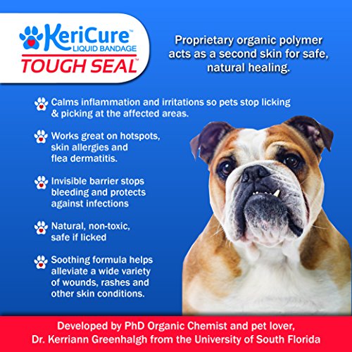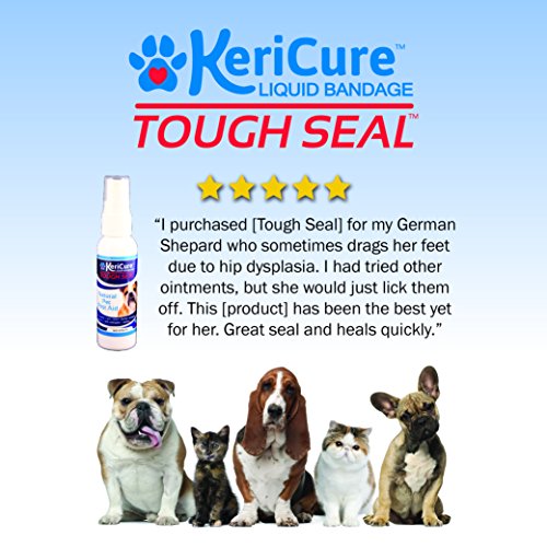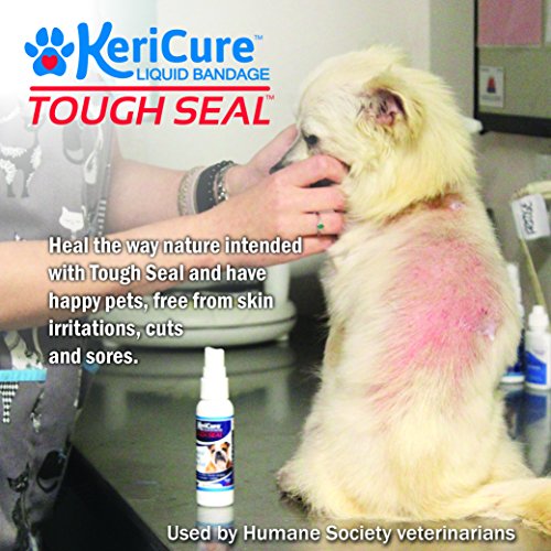 -. Feature : Tough Seal is a water-based spray on liquid bandage that provides a natural, breathable barrier against dirt and germs. / •Formulated for dogs, cats, small animals, horses and livestock •Non-toxic, non-irritating formula •Safe for pets of all sizes •Helps speed the natural healing process •Use of disinfecting solutions, antibacterial creams and ointments is permissible P.R.Ior to and after application of the product •Comes off naturally after wound heals •Safe if ingested / KeriCure'sTM Tough SealTM Liquid Bandage helps speed the natural healing process after cuts, hot spots, bites, scrapes, burns, wounds, abrasion and lesions. Formulated and for use on small and large pets, Tough Seal soothes skin irritations and helps stock the constant licking and scratching that comes with skin irritations, allergies, and hot spots. Calms inflammation and irritations so that pets stop licking and picking at the site. Tough Seal does not replace antiseptics like Vetericyn, but should be used in conjunction with them to form a barrier against germs so that your pet is protected against infections throughout the healing process.
