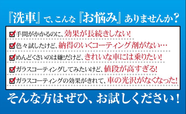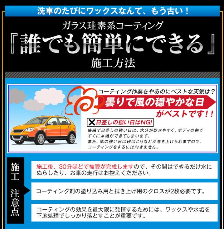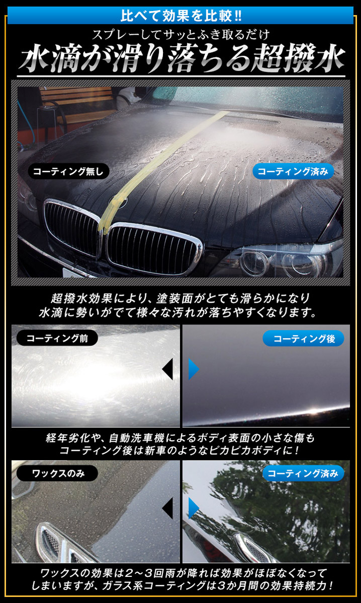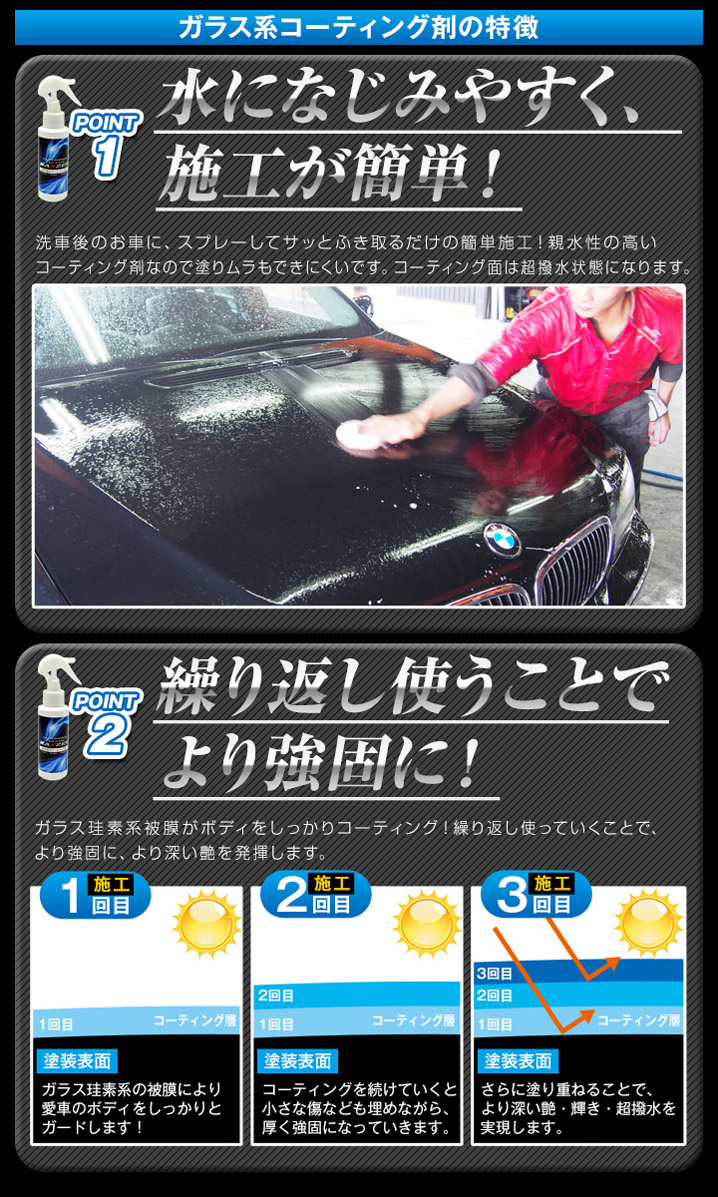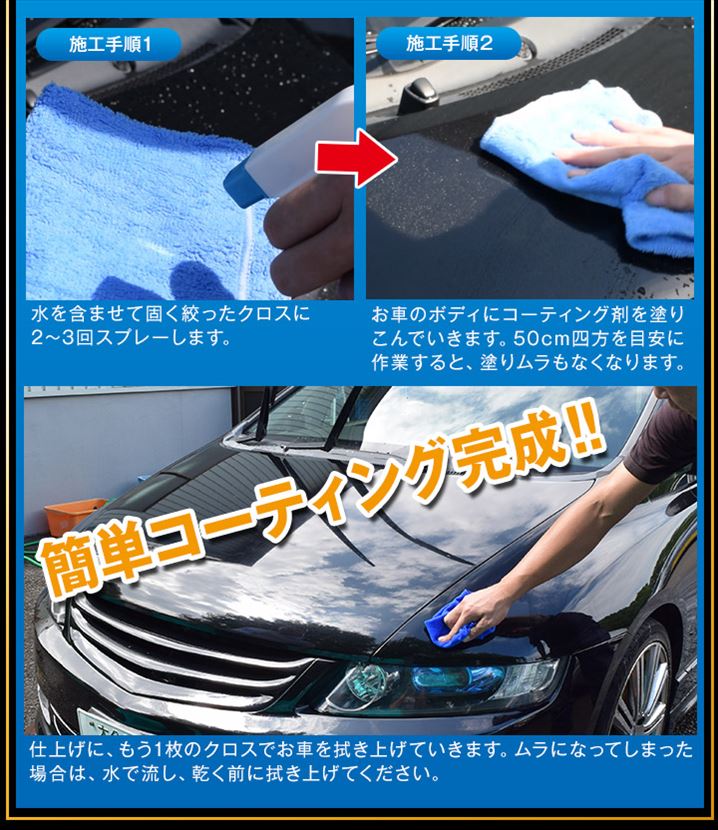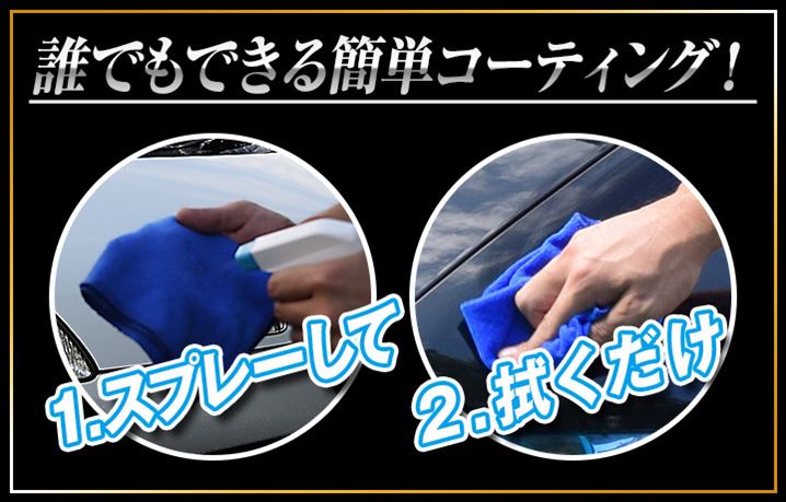 ●洗車後のお車に、スプレーしてサッとふき取るだけで施工が簡単です。