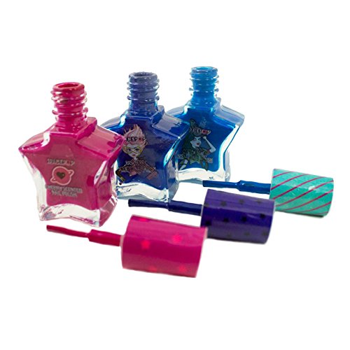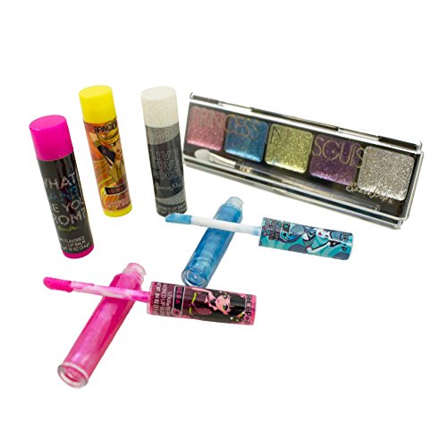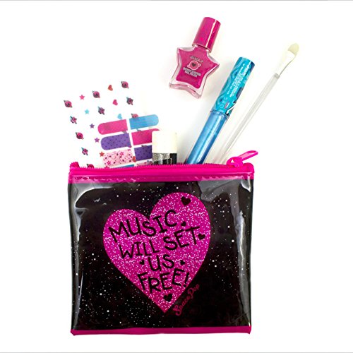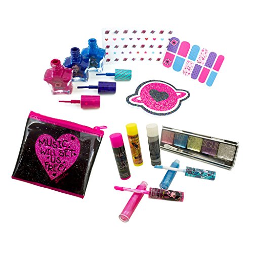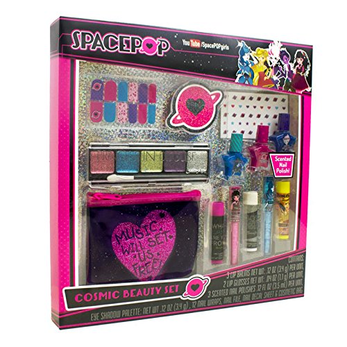 The SpacePOP Cosmic Beauty Set includes everything your child needs to become a rockstar princess. This beauty set includes 3 lip balms, 2 lip glosses, 3 scented nail polishes, 1 eye shadow pallet with brush, 12 nail wraps, 1 nail file, 1 nail decal sheet and 1 cosmetic bag. Lip balms are flavored like cherry, lime and vanilla. Lip glosses are flavored like strawberry and berry. Nail polishes are non-toxic and scented like strawberry and raspberry. This large kit is perfect for birthdays, party favors and all fans of the SpacePOP girls!Feature