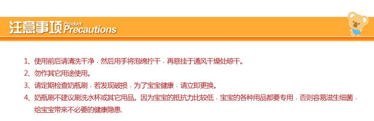 ? ? ? ? ?3.请定期检查奶瓶刷,若发现破损,为了宝宝健康,请立即更换。