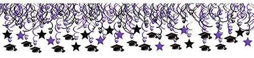 Features purple and black hanging plastic swirls with a metallic finish. Some swirls come with attached die-cut black plastic grad caps or purple and black plastic star cutouts.