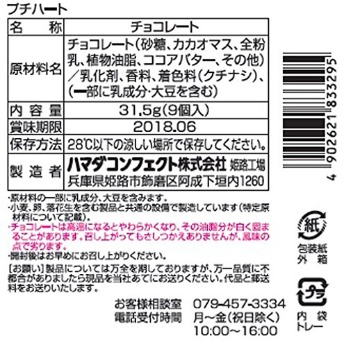 原材料:チョコレート(砂糖、カカオマス、全粉乳、植物油脂、ココアバター、その他)/乳化剤、香料、着色料(クチナシ)、(一部に乳成分・大豆を含む)