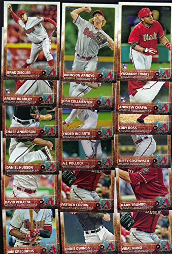 [Product Information]- This is an Arizona Diamondbacks 2015 Topps MLB Baseball Regular Issue complete mint 26 card team set; it was never issued in factory form. All Diamondbacks cards from series #1 and #2 including Paul Goldschmidt, Chris Owings, Vidal Nuno, Didi Gregorius, Aaron Hill, Addison Reed, David Peralta, Miguel Montero, Jake Lamb, Trevor Cahill, Cody Ross, Tuffy Gosewisch, Mark Trumbo, Daniel Hudson, Jeremy Hellickson, Chase Anderson, Archie Bradley, Brad Ziegler, Yasmany Tomas, Patrick Corbin, A.J. Pollock, Ender Inciarte, Josh Collmenter, Bronson Arroyo, Andrew Chafin and a 2014 Arizona Diamondbacks team standings card.