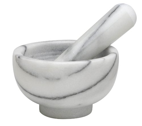 - Made from solid Carrara marble; complements any decor; mortar 3.8-inch x 3.8-inch, pestle 4-inch