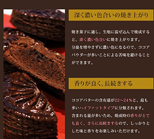 코코아 버터의 함유량이 가장 많은 하이파《도》타입나오고, 향기가 좋고, 지속합니다.아이스크림이나 유제품과의 궁합이 좋은 때문에,구운 과자는 물론,케익의 원단이나 크림,디저트 등에도 추천입니다.