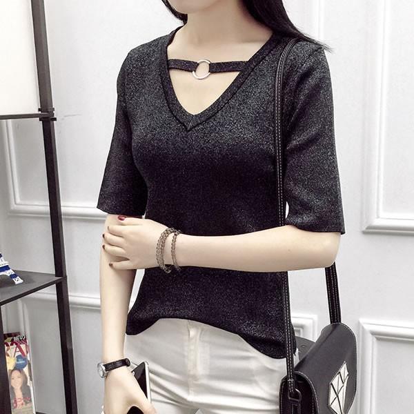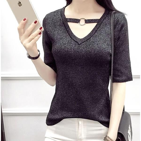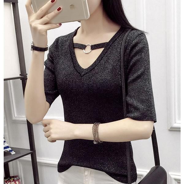 | ラメ Vネック リング カットソー 無地 黒 ブラック 【Vネック トップス カットソー レディース 女性 黒 ブラック black ロンデルブラック セクシー 秋冬 ラメ シャイニー グリッター vネック トップス】 | |