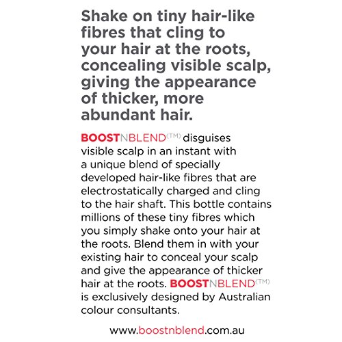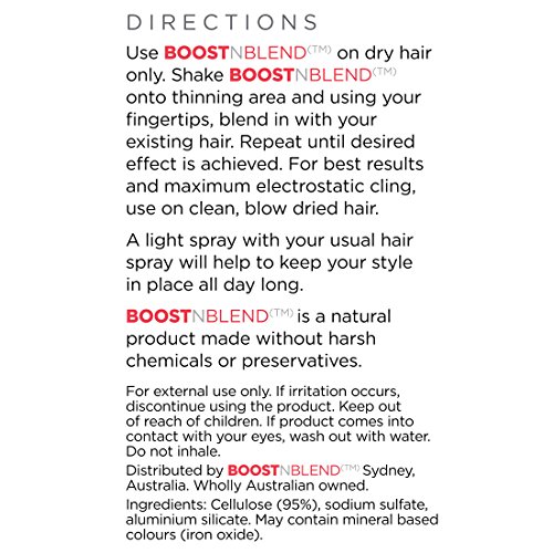 Works with Rogain for women. Simply apply Rogain once a day then when it has dried, shake in BOOSTnBLEND hair thickener which will instantly make the new regrown hair up to ten times thicker.