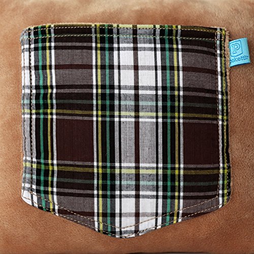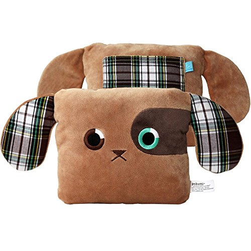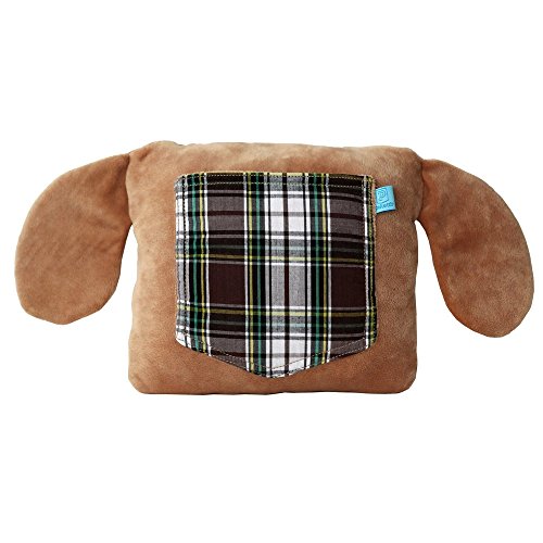 -. Feature : Small (7.5" square) plush puppy dog pillow with green and brown plaid cotton fabric details / Useful 4x5"plush-lined back pocket to hold a phone, notebook, eyeglasses or tooth fairy goodies / Embroidered brown and green eyes, and big soft puppy ears made from plaid and plush / Designed by young entrepreneurs, Sydney (16) and Toni (13), from Palo alto, California / Made with the highest quality materials and care, a wonderful gift for kids, teens and tweens