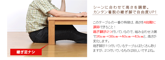 商品について:4段階に高さが調節できる便利な折れ脚式日本製こたつと色柄豊富なこたつ布団のセットです。こたつ布団はクッションやカバーにも使われる丈夫な国産生地を使用し、国内工場で綿入れ・縫製をしました。ボリュームたっぷり!すみまでしっかり綿が入ったふっかふかのこたつ布団です。600W石英管ヒーター(手元コントローラー式)