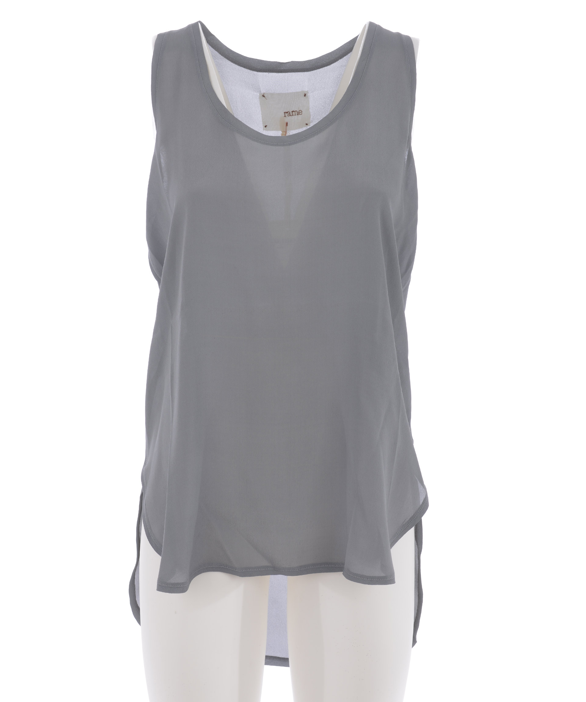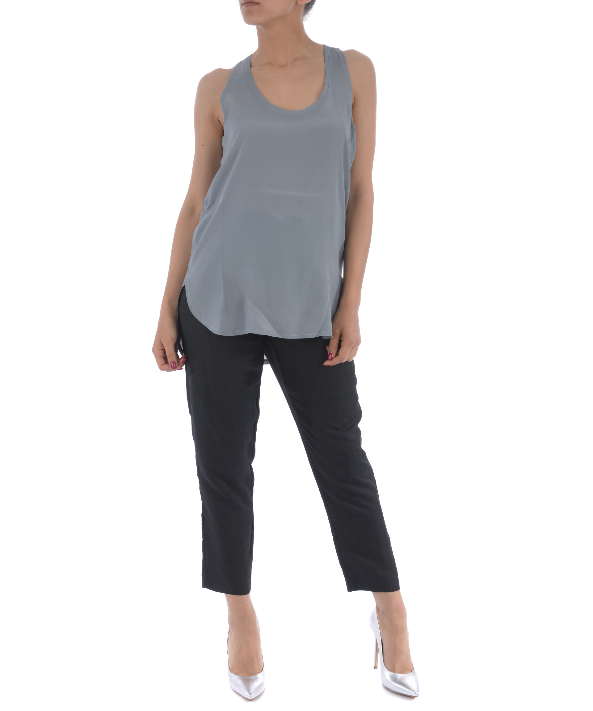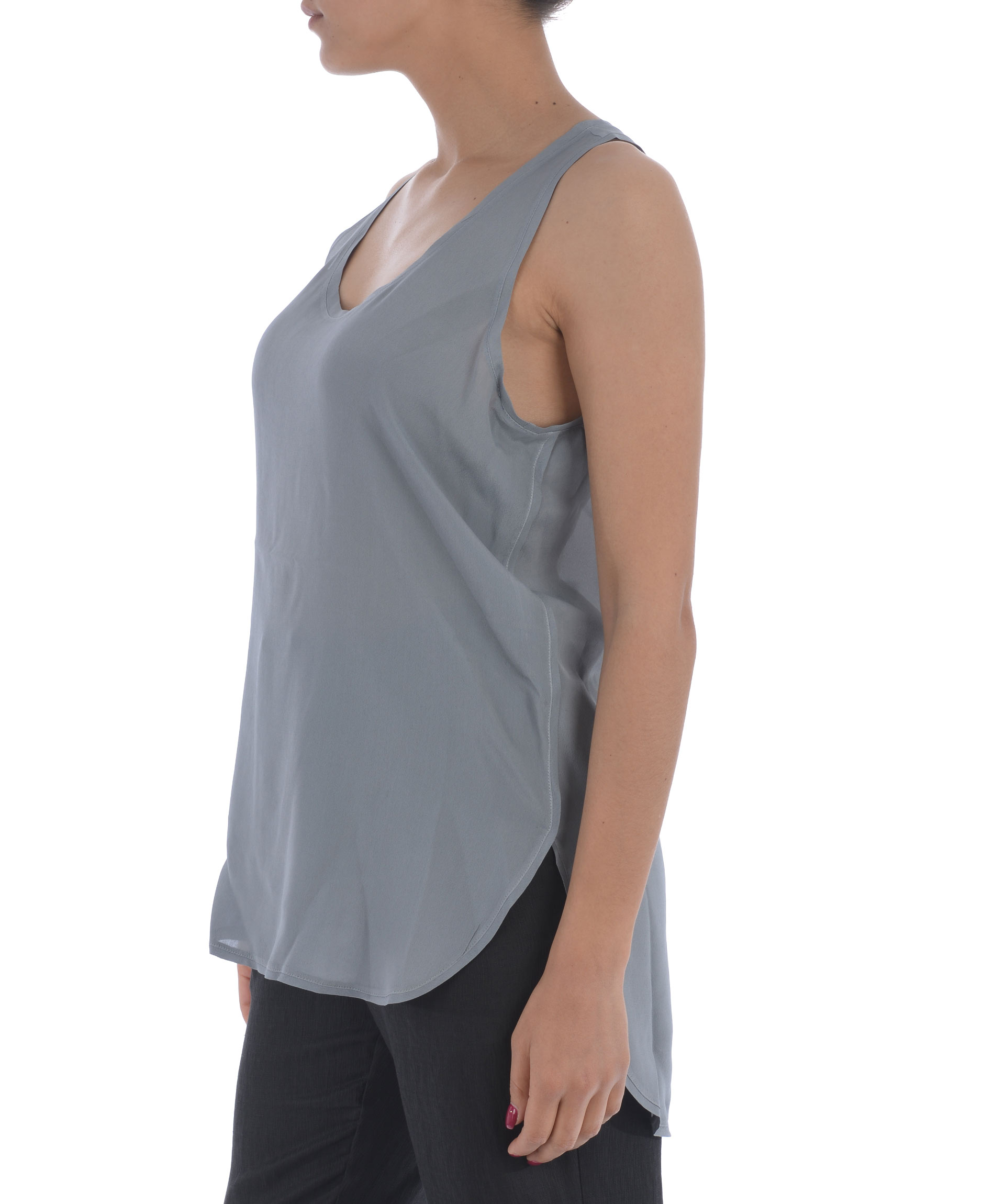Top Rame in raso di misto seta Grigio. Scollo rotondo. Smanicato. Pannello posteriore più lungo. Misura in foto I 65% viscosa, 35% seta