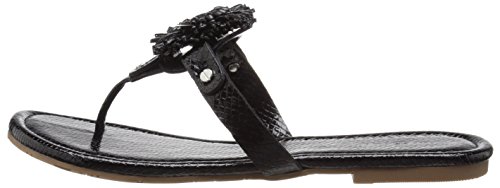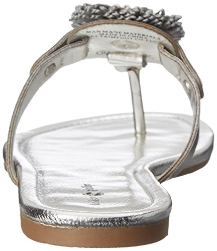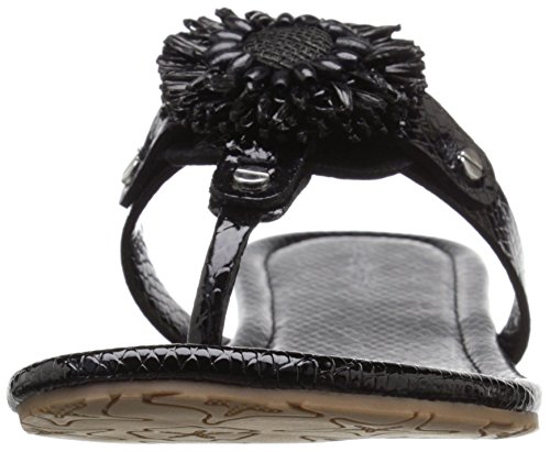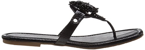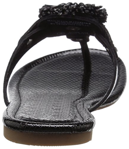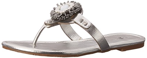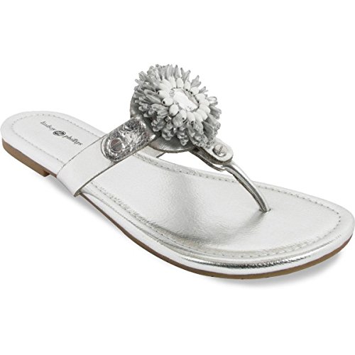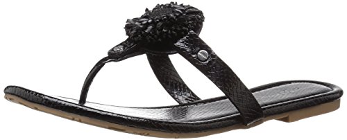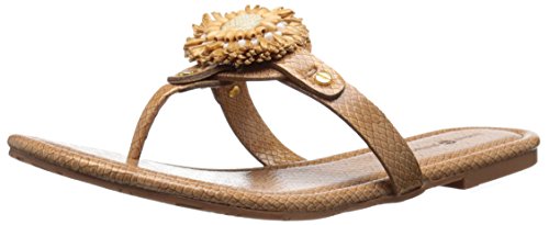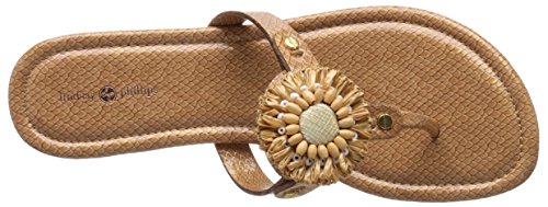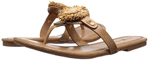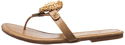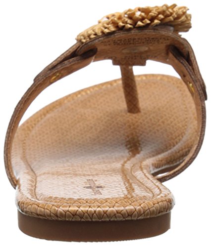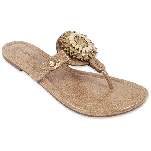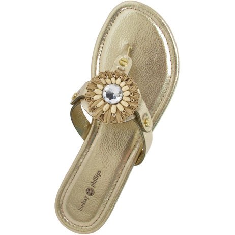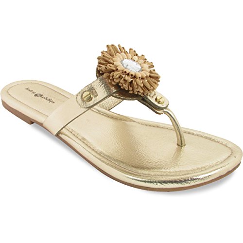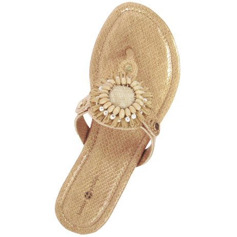 Product DescriptionPadded pancake flat sandal with tonal raffia flower, wood beads and tpr unit outsole0