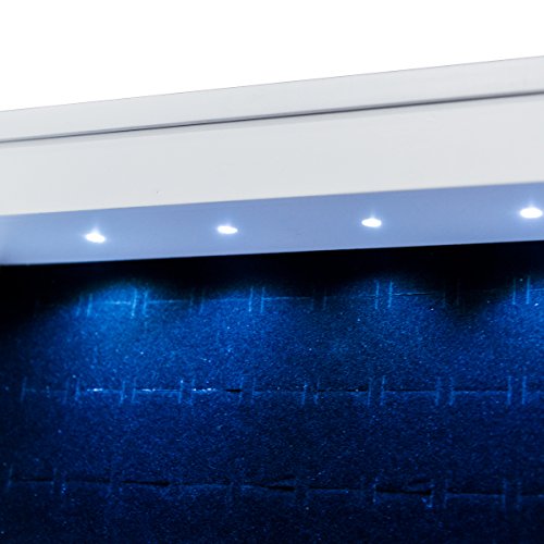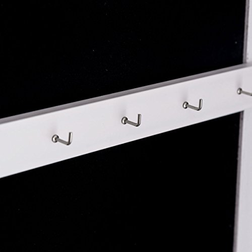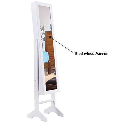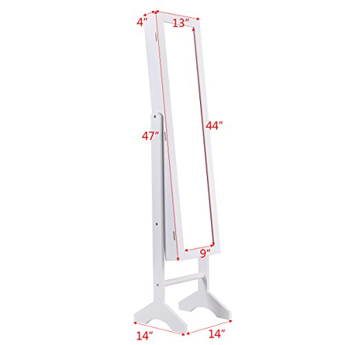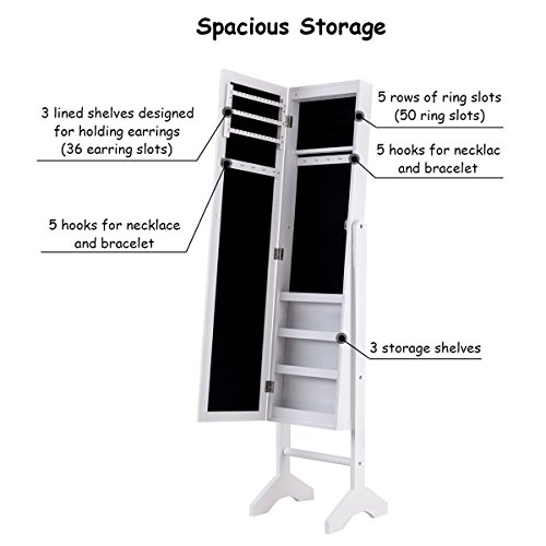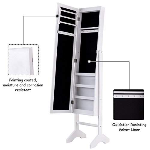 Features: Painting coated, moisture and corrosion resistant 3 lines for finger ring or earring , 10 hooks, 4 storage racks With full size mirror is convenient for you to try your clothes or jewelry on Features beautiful lights, make your jewelry more dazzling Helps your jewelry in an organized manner and prevents them from getting tangled Tilts easily for angle adjustment with a sturdy stand Fits with you bedroom decor Easy to assemble easy to clean
