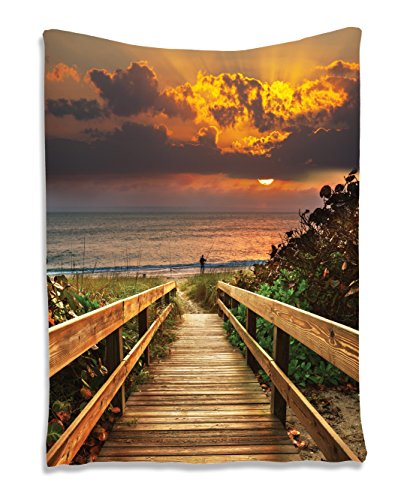 Beach Decor for Fisherman Wooden Bridge Panoramic Sunset Ocean View Nature Art Picture Landscape Seascape Marine House Wall Hanging Tapestry Dorm Bedroom Living Room Decorations, Brown Orange Green