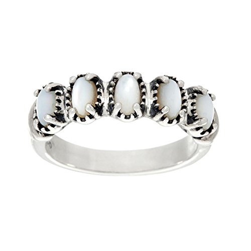 -. Feature : Genuine White Mother of Pearl and .925 Sterling Silver / Measures approximately 1/4" long x 3/4" wide / See Ruler View for accurate sizing. Silver may tarnish over time. / Handcrafted in America with lifetime warranty on all jewelry / Serrated bezels frame five sweet white mother of pearl gemstones in this stunning band ring.