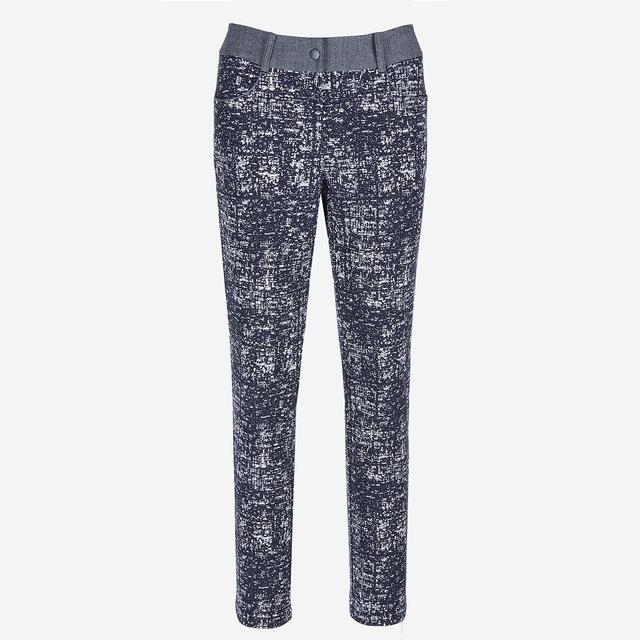 유니크한 느낌의 패턴 장식에 허릿단 컬러 배색으로 포인트를 준 팬츠입니다.