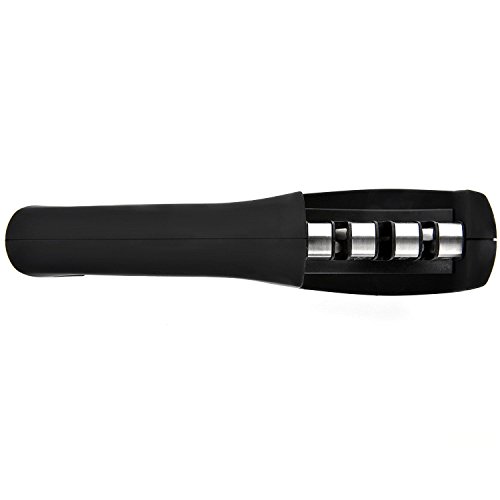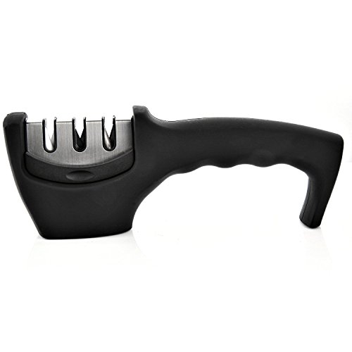 Three Stage Knife Sharpener, coarse and fine-sharpening design, coarse sharpening is for dull or blunt blades and need to run the knife 2-4 three times.The fine sharpening, smooths knife edge and adds more sharpness