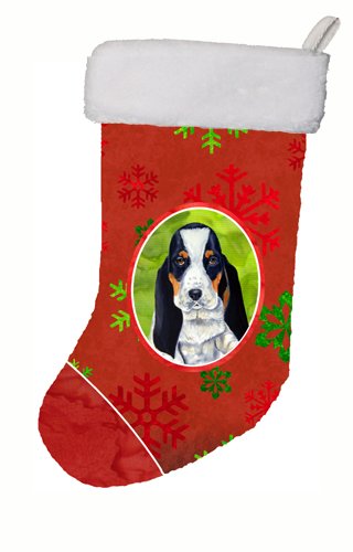Caroline's Treasures LH9329-CS Basset Hound Red and Green Snowflakes Holiday Christmas Stocking, 11 x 18", Multicolor