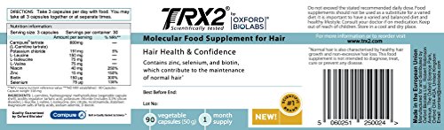 This is the first supplement to contain Potassium chloride, L-carnitine- L-tartrate, BCAA and Nicotinic Acid delivered via a proprietary potassium channel-stimulating complex. TRX2 Molecular Food Supplement also contains Biotin, which contributes to the maintenance of normal hair. The TRX2 formula is a 100% natural, drug-free food supplement designed to improve the functioning of hair follicles. Nutrients, such as the vitamin Biotin, are commonly associated with hair growth.Feature