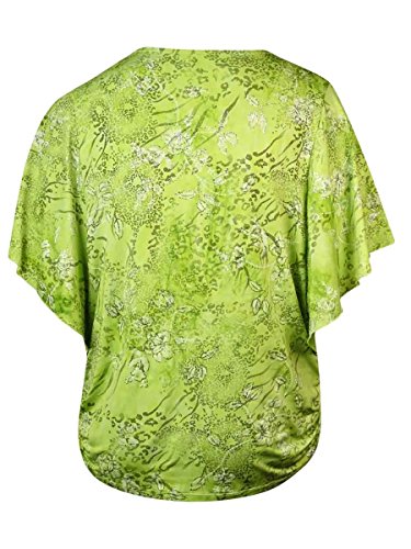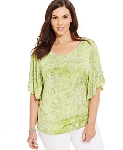 Top features no lining, round neck, flutter sleeves, glittered printed jersey fabric, ruched hips, and pullover style.