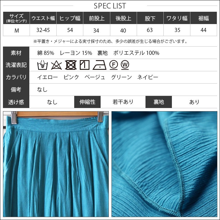 実寸:ウエスト幅 32-45cm ヒップ幅 54cm 前股上 34cm 後股上 40cm 股下 63cm ワタリ幅 35cm 裾幅 44cm