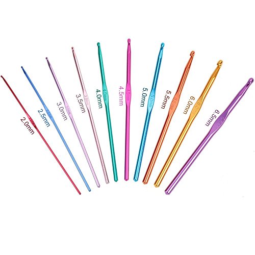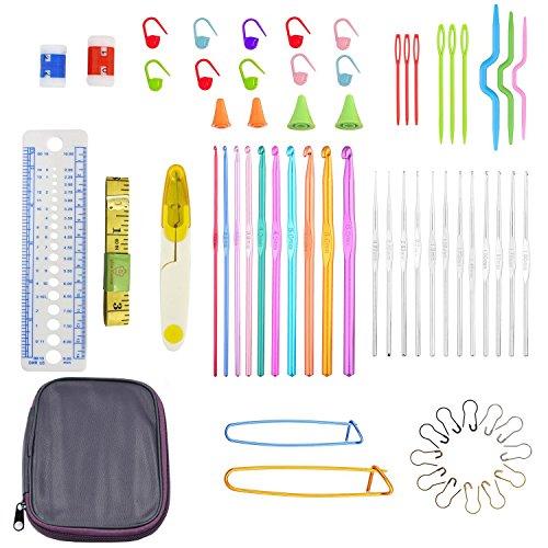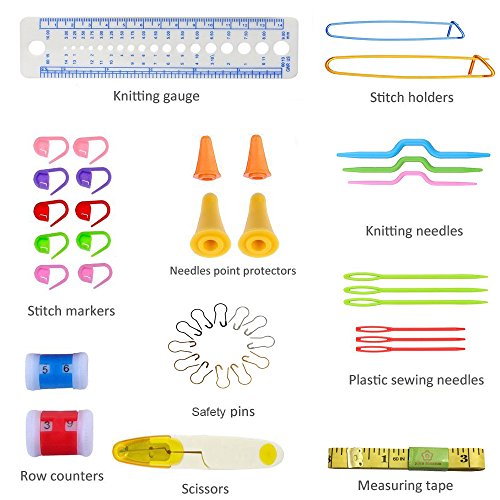 - The kit contains:12 Silver Hooks(0.6mm-1.9mm), 10 Aluminum Crochet Hooks(2.0mm-6.5mm), 6 x Plastic Sewing Needles/Yarn Needles,4 x Needles Point Protectors,2 x Row Counter,3 x Crooked Needle, 2 x Aluminium Stich Holders,1 x White Stitch Measure Needle Gauge Ruler,1 x Tape measure,1 x Scissors, 10 x Plastic Split Ring Markers,12 x Metal safety pins