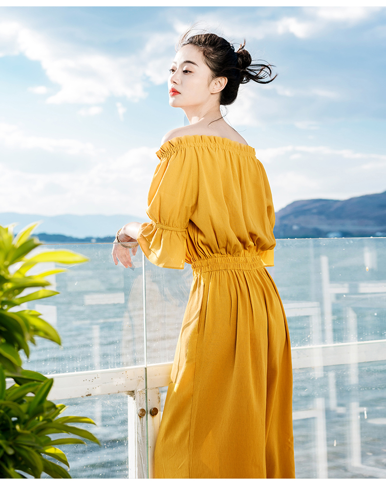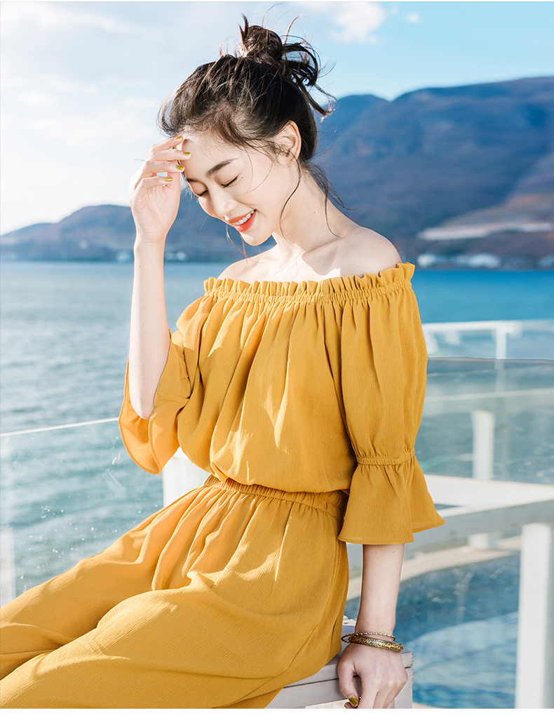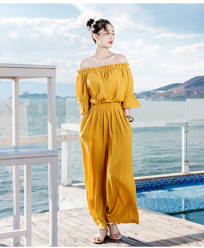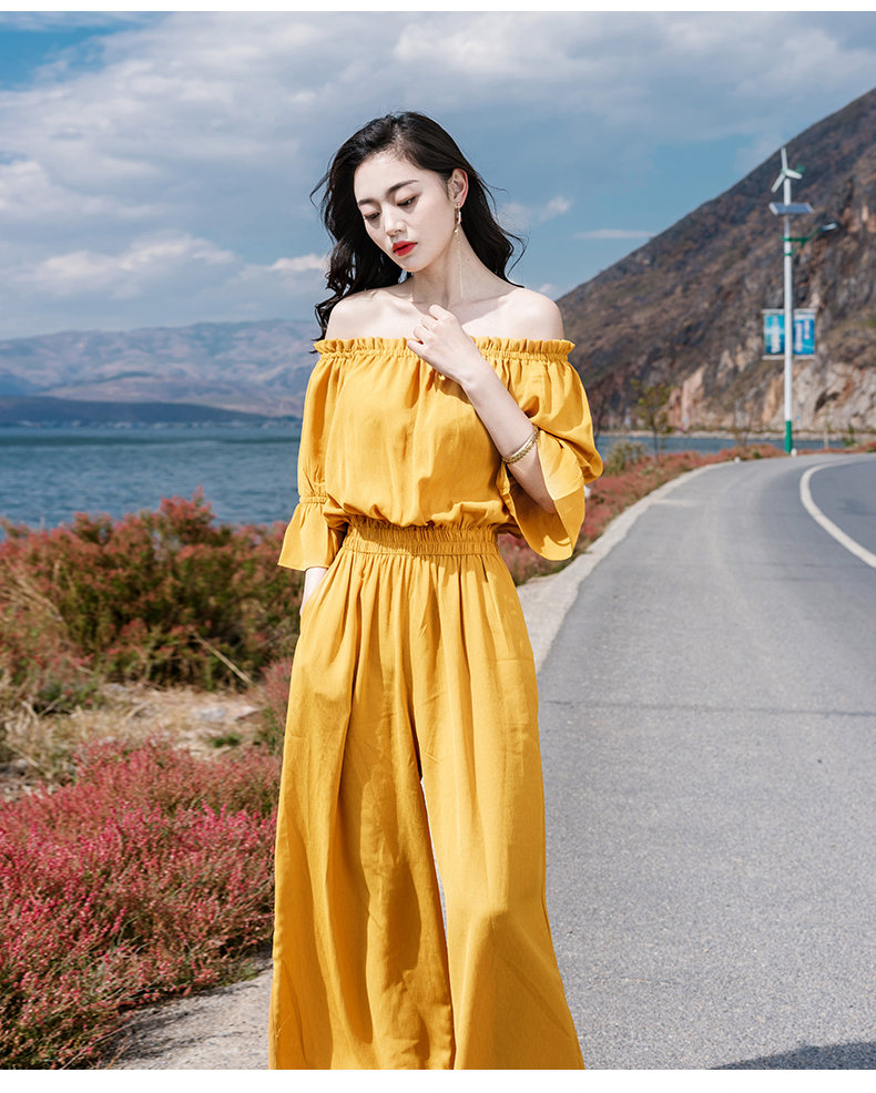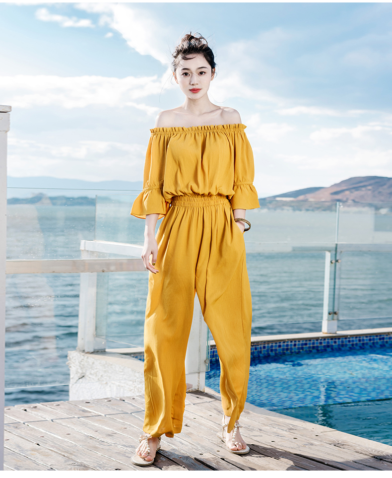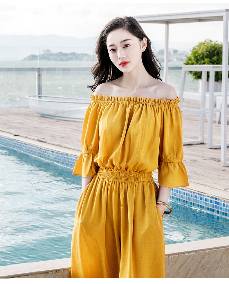 オフショルトップス+ワイドパンツのオールインワンです。