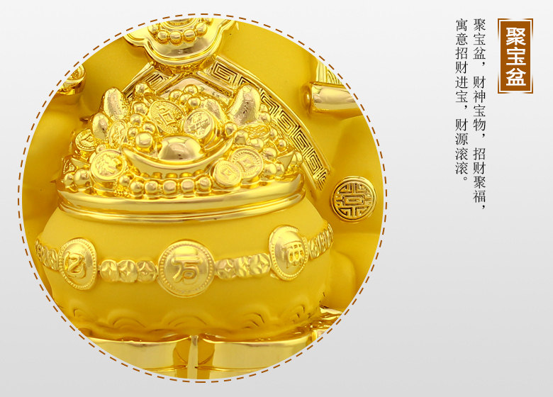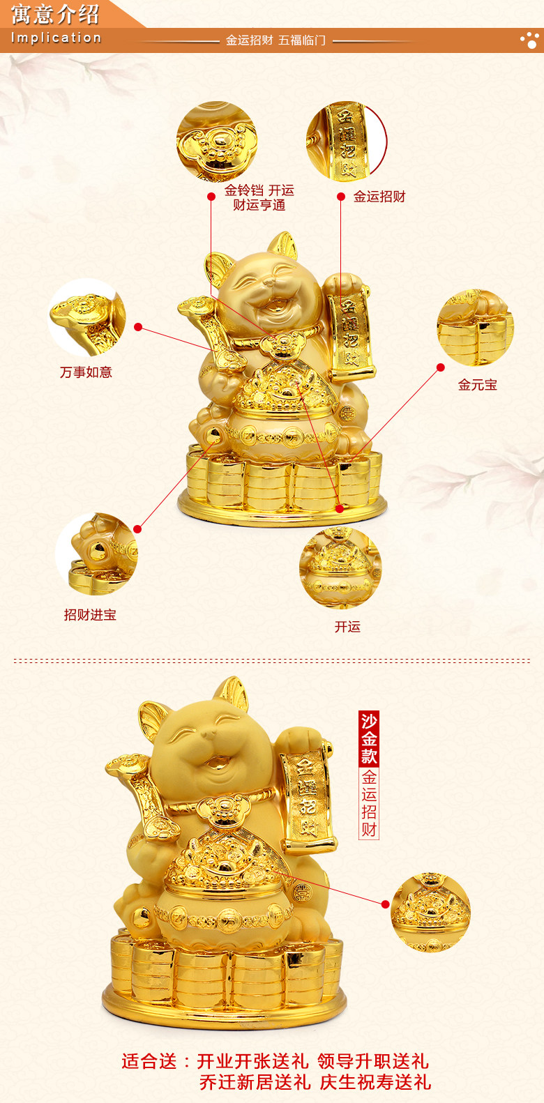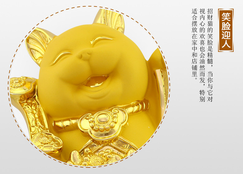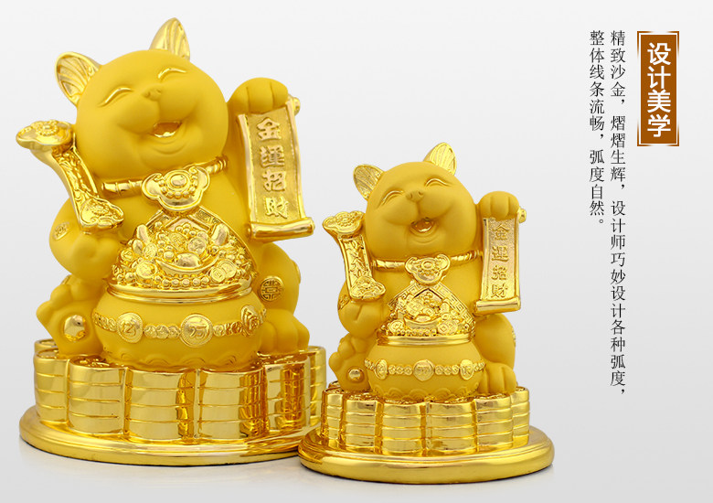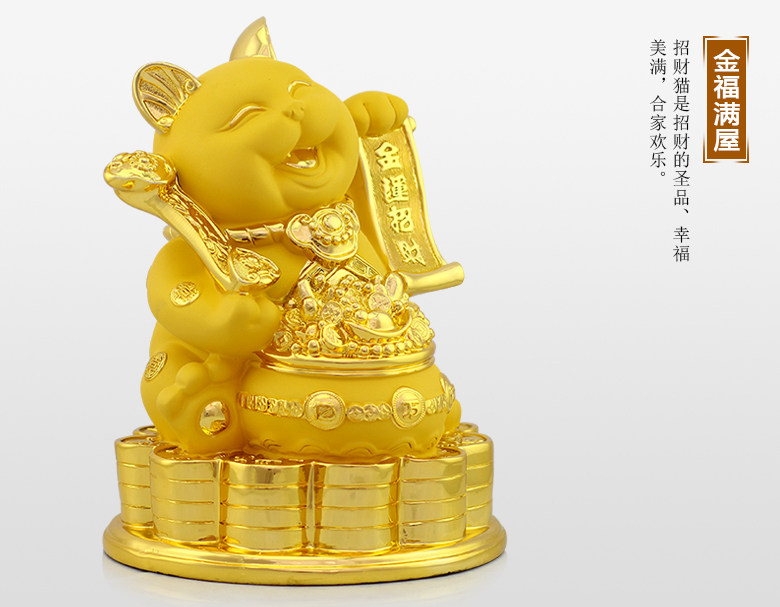 即是存钱罐又是招财猫。举双手,表示财和福一起来。招财猫胸前的金铃象征开运、招财、招福、缘起的意思。招财猫手里配饰一般有万宝槌、葫芦、金鱼、百宝袋、蒲团扇、达摩祖师等。招财猫身上颜色的寓意:金色代表:财运亨通