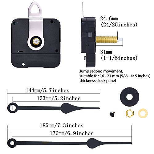 Movement size: shaft length is 31 mm (1-1/ 5 inch); Thread length is 24.6 mm (24/ 25 inch); Jump second movement, suitable for 16 - 21 mm (5/ 8 - 4/ 5 inch) thickness clock panel