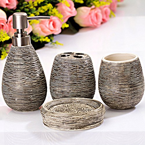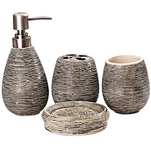 - Contemporary deluxe ceramic 4 piece bathroom accessory set includes 1 round soap dish, 1 lotion/soap pump dispenser, and 2 tumbler.